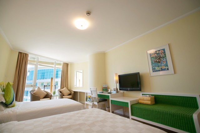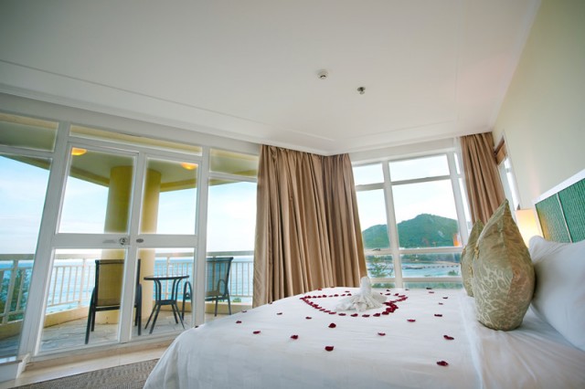 豪華海景房,面積35平方米,樓層2-9層,有陽臺,180度海景,大床(2*2米),雙標(biāo)(1.35*2米),90%有浴缸 免費寬帶